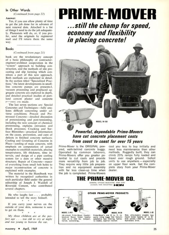 Prime-Mover is the ORIGINAL powered, walk-behind concrete buggy. Operated by common laborers, Prime-Movers offer you greater potential to cut costs and provide more versatility from job to job. They require very little job preparation and no equipment assembly with far less clean-up time when the job is completed. Prime-Movers cost you less to buy initially and need less maintenance than other methods. Ruggedly built, they can climb 20% ramps fully loaded and travel over rough ground. Safest units to use anywhere - especially on upper floor work. Get the complete story from your Prime-Mover dealer.
