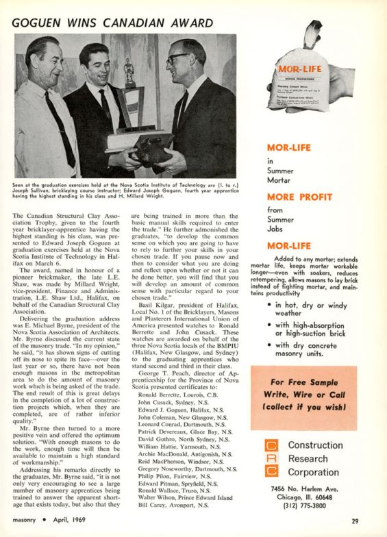 The Canadian Structural Clay Association Trophy, given to the fourth year bricklayer-apprentice having the highest standing is his class, was presented to Edward Joseph Goguen at graduation exercises held at the Nova Scotia Institute of Technology in Halifax on March 6.