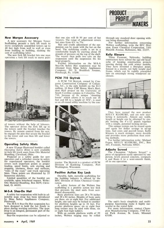 A PCM 710 Skytrak, owned by Congaree Construction Company of Columbia, S.C., is the only forklift on the $3.5 million, 10 floor Cliff House Men's Resident Hall project on the University of South Carolina campus in Columbia. The 710, because of its unique "shooting boom" which allows it to reach out 16 feet and lift to a height of 30'6", is used as an all-round utility machine by the contractor. The Skytrak is a product of PCM Division of Koehring Company, Port Washington, Wisconsin.