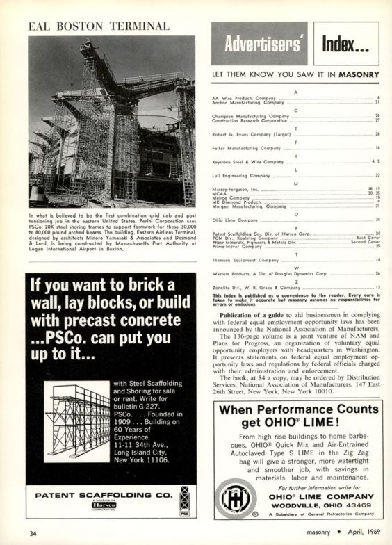 In what is believed to be the first combination grid slab and post tensioning job in the eastern United States, Perini Corporation uses PSCo. 20K steel shoring frames to support formwork for these 30,000 to 80,000 pound arched beams. The building, Eastern Airlines Terminal, designed by architects Minoro Yamasaki & Associates and Desmond & Lord, is being constructed by Massachusetts Port Authority at Logan International Airport in Boston,