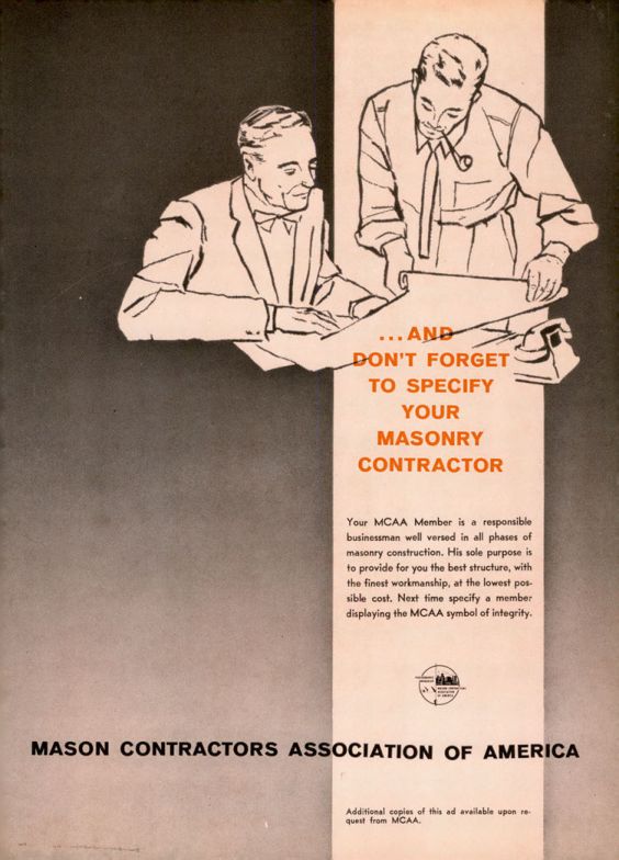 Your MCAA Member is a responsible businessman well versed in all phases of masonry construction. His sole purpose is to provide for you the best structure, with the finest workmanship, at the lowest possible cost. Next time specify a member displaying the MCAA symbol of integrity.