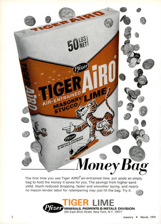 The first time you use Tiger AiRO air-entrained lime, put aside an empty bag to hold the money it saves for you. The savings from higher sand yield, much-reduced dropping, faster and smoother laying, and nearly no mason-tender labor for retempering may just fill the bag. Try it.