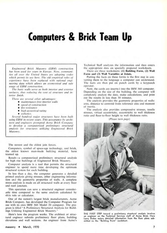 One of the nation's largest brick manufacturers, Acme Brick Company, has developed the Computer Program for use with its own IBM 360 Model 20 computer. The program is titled "A Preliminary Structural Analysis for Buildings Utilizing Engineered Brick Masonry."