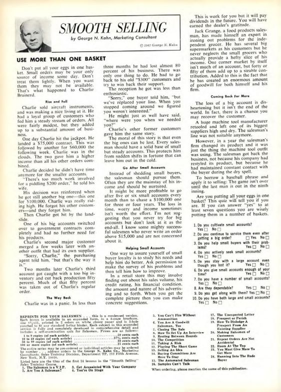 Jack Grange, a food products salesman, has made himself an expert in ironing out problems for the independent grocer. He He has several big supermarkets as his customers but he never neglects the small grocers who actually provide a hefty slice of his income. One corner market by itself isn't much of an account, but forty or fifty of them add up to a sizable contribution. Added to this is the fact that he has created an enormous amount of goodwill for both himself and his firm.