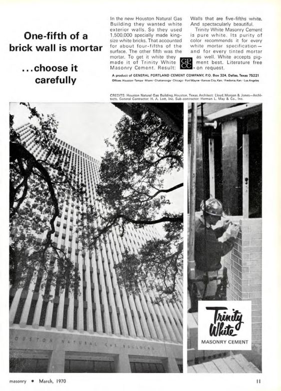 In the new Houston Natural Gas Building they wanted white exterior walls. So they used 1,500,000 specially made king-size white bricks. That accounted for about four-fifths of the surface. The other fifth was the mortar. To get it white they made it of Trinity White Masonry Cement.