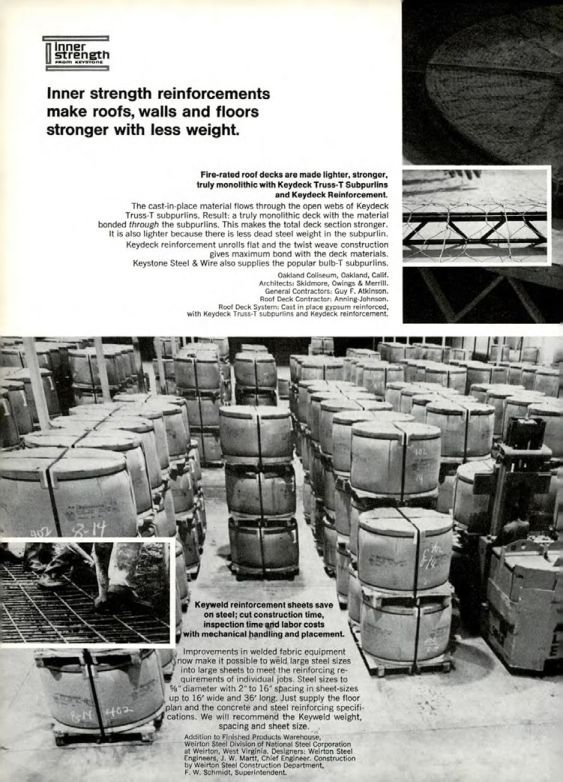 Oakland Coliseum, Oakland, Calif. Architects: Skidmore, Owings & Merrill. General Contractors: Guy F. Atkinson. Roof Deck Contractor: Anning-Johnson. Roof Deck System: Cast in place gypsum reinforced, with Keydeck Truss-T subpurlins and Keydeck reinforcement.