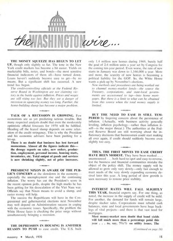 The depression in housing is another reason to push to ease credit. The U.S. built masonry March, 1970 only 1.4 million new homes during 1969, barely half the goal of 2.6 million units a year set by Congress for the coming ten-year period. Even worse, the rate of new starts in January was down to 1,166,000 a year. More and more, the scarcity of new homes is becoming a political liability for the GOP. So, the White House wants a pick-up by November's elections.