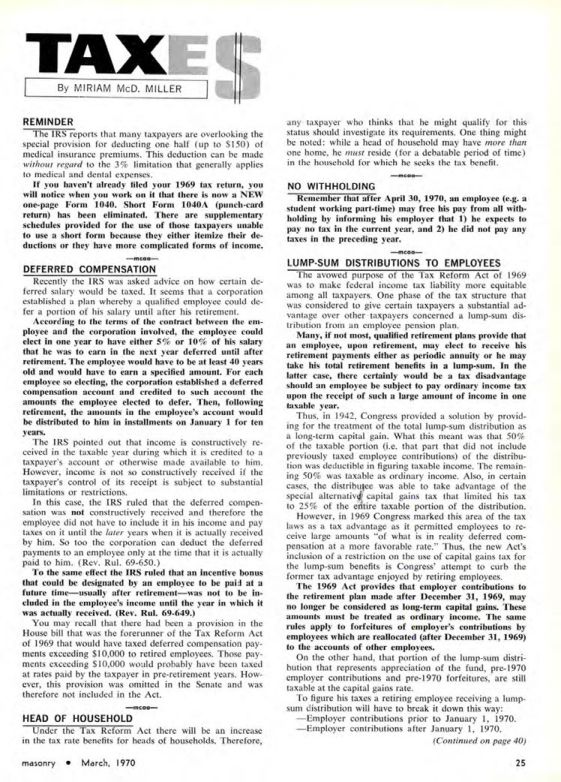 If you haven't already filed your 1969 tax return, you will notice when you work on it that there is now a NEW one-page Form 1040. Short Form 1040A (punch-card return) has been eliminated. There are supplementary schedules provided for the use of those taxpayers unable to use a short form because they either itemize their deductions or they have more complicated forms of income.