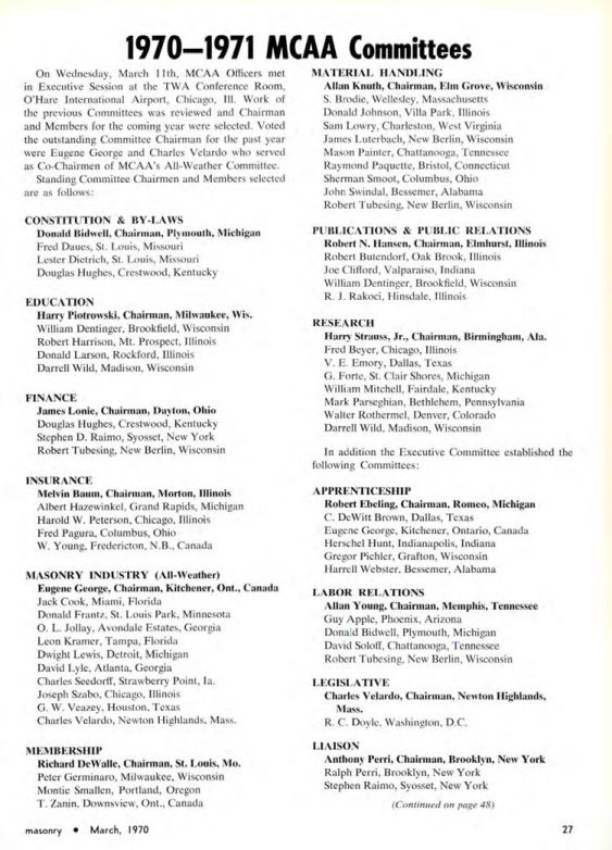 On Wednesday, March 11th, MCAA Officers met in Executive Session at the TWA Conference Room, O'Hare International Airport, Chicago, III. Work of the previous Committees was reviewed and Chairman and Members for the coming year were selected. Voted the outstanding Committee Chairman for the past year were Eugene George and Charles Velardo who served as Co-Chairmen of MCAA's All-Weather Committee. Standing Committee Chairmen and Members selected are as follows: