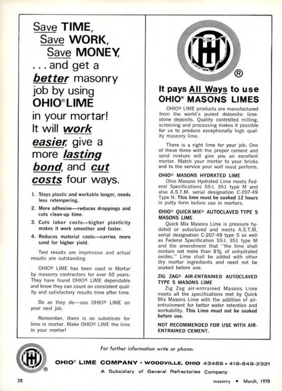 OHIO® LIME has been used in Mortar by masonry contractors for over 50 years. They have found OHIO® LIME dependable and know they can count on consistent quality and satisfactory results time after time.