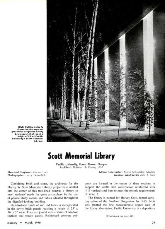 The library is named for Harvey Scott, famed early-day editor of the Portland Oregonian. In 1863, Scott was granted the first baccalaureate degree west of the Rocky Mountains. Pacific University is a depository (Continued on page 30)