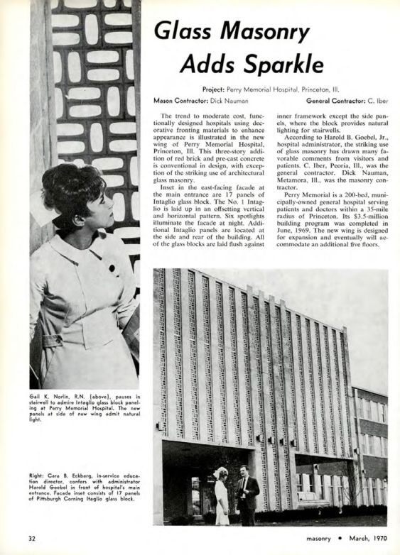 According to Harold B. Goebel, Jr., hospital administrator, the striking use of glass masonry has drawn many favorable comments from visitors and patients. C. Iber, Peoria, III., was the general contractor. Dick Nauman, Metamora, III., was the masonry contractor.