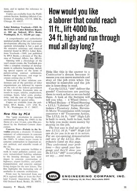 Help like this is the answer to a Contractor's dream because it means you can move materials and stay at the job even when the weather is miserable and the job site is knee-deep in mud. Can the LULL "400" deliver the goods? Contractors are putting them to work as fast as we can build them. A look at the features will tell you why. 4 Wheel Drive-4 Wheel Brakes-4 Wheel Steering • LULL "Lifetime" Hydraulic Cylinders Planetary Axles, Revers-O-Matic Transmission with torque converter 46" Transverse Action. The LULL 34 ft. "400" High-Lift is built to work, built to last, built to help you make more money by staying on the job. The best way to find out what the new LULL 34 ft. "400" High-Lift can do for you is to see it in action. For an eye-opening demonstration call any of the LULL Distributors listed on this page. They understand your problems they speak your language and they'll show you the LULL"400" is everything we say...and more.
