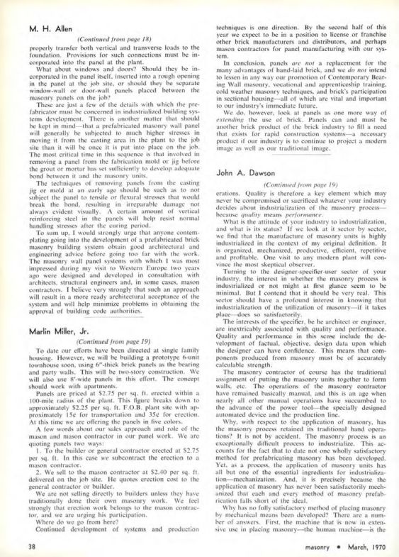 Turning to the designer-specifier-user sector of your industry, the interest in whether the masonry process is industrialized or not might at first glance seem to be minimal. But I contend that it should be very real. This sector should have a profound interest in knowing that industrialization of the utilization of masonry-if it takes place does so satisfactorily.