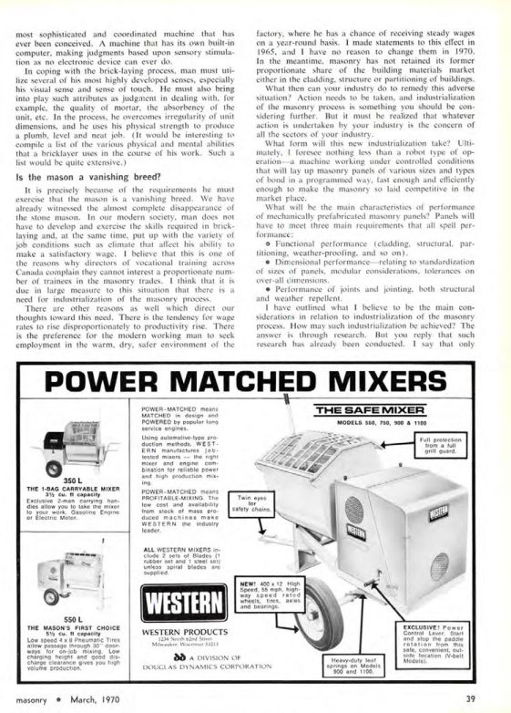 There are other reasons as well which direct our thoughts toward this need. There is the tendency for wage rates to rise disproportionately to productivity rise. There is the preference for the modern working man to seek employment in the warm, dry, safer environment of the factory, where he has a chance of receiving steady wages on a year-round basis. I made statements to this effect in 1965, and I have no reason to change them in 1970. In the meantime, masonry has not retained its former proportionate share of the building materials market either in the cladding, structure or partitioning of buildings.