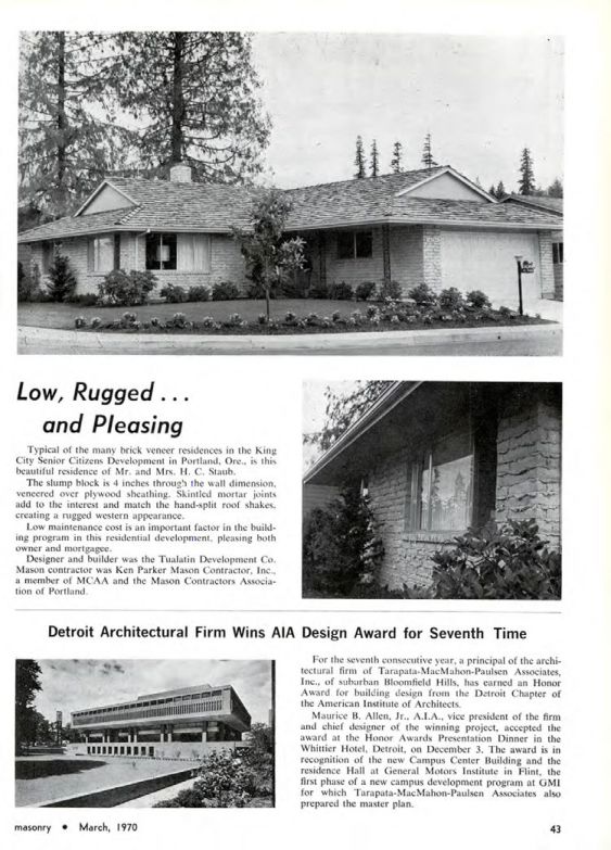 Designer and builder was the Tualatin Development Co. Mason contractor was Ken Parker Mason Contractor, Inc., a member of MCAA and the Mason Contractors Association of Portland.