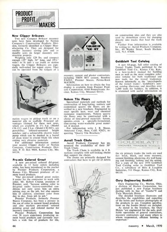 A new 64-page, full color catalog of Trowel Trades Tools published by the Goldblatt Tool Co., Kansas City, Kan., is a how-to-do-it manual for building men as well as the most complete reference volume for both traditional and new tools for the trowel tradesman. Known informally as the "encyclopedia of the trowel trades", Goldblatt's newest catalog illustrates and describes over 1,200 tools for builders. In addition, it is crammed with useful information on the six primary trades the tools are used for: brick, block, and stone masonry, cement finishing, plastering, dry wall hanging and finishing, lathing and tile setting.