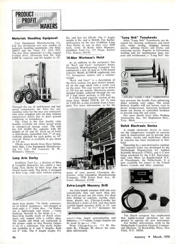 The handle and blade are connected at the proper angle so that floating fatigue is cut to a minimum. The darby blades are available in 4' and 5' lengths. Both are 4" wide. The 4' length weighs 44 lbs, and lists for $22.00. The 5' length weighs 6 lbs. and is $24.00. For further information on the new Goldblatt Long Arm Darby or any of their over 1600 tools, write: Si Kraft, Sales Manager, Goldblatt Tool Co., 511 Osage, Kansas City, Kansas, 66110.