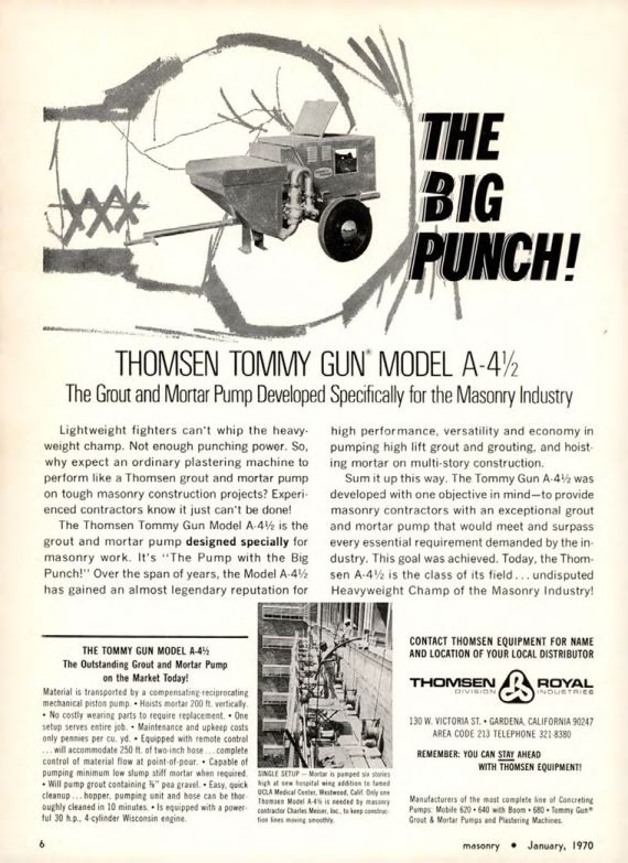 Sum it up this way. The Tommy Gun A-4½ was developed with one objective in mind-to provide masonry contractors with an exceptional grout and mortar pump that would meet and surpass every essential requirement demanded by the industry. This goal was achieved. Today, the Thomsen A-4½ is the class of its field... undisputed Heavyweight Champ of the Masonry Industry!