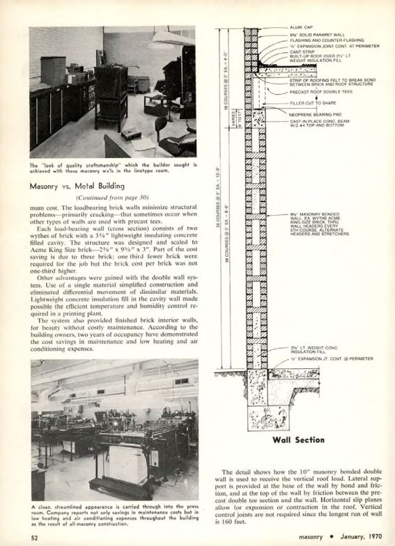 Each load-bearing wall (cross section) consists of two wythes of brick with a 35%" lightweight insulating concrete filled cavity. The structure was designed and scaled to Acme King Size brick-25%" x 9%" x 3". Part of the cost saving is due to these brick; one third fewer brick were required for the job but the brick cost per brick was not one-third higher.