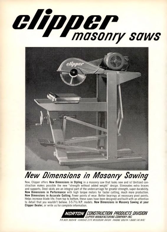 New Dimensions in Performance with high torque motors for faster cutting, much more production. New Dimensions in Accurate Cutting. Fewer points of wear. Better bearings at necessary pivot points. Helps increase blade life. From top to bottom, these saws have been designed and built with an attention to detail that you wouldn't believe. 3-5-71½ H.P. models. New Dimensions in Masonry Sawing at your Clipper Dealer, or write us for complete information.