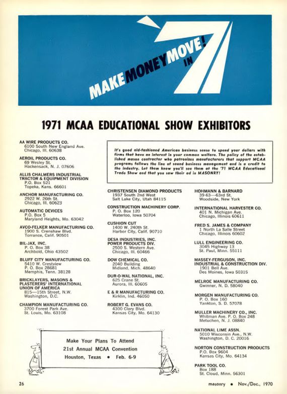 It's good old-fashioned American business sense to spend your dollars with firms that have an interest in your common welfare. The policy of the established mason contractor who patronizes manufacturers that support MCAA programs follows the line of sound business management and is a credit to the industry. Let them know you'll see them at the '71 MCAA Educational Trade Show and that you saw their ad in MASONRY!