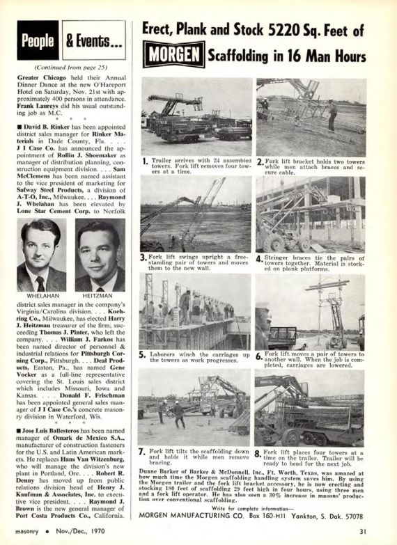Duane Barker of Barker & McDonnell, Inc., Ft. Worth, Texas, was amazed at how much time the Morgen scaffolding handling system saves him. By using the Morgen trailer and the fork lift bracket accessory, he is now erecting and stocking 180 feet of scaffolding 29 feet high in four hours, using three men and a fork lift operator. He has also seen a 30% increase in masons' production over conventional scaffolding.