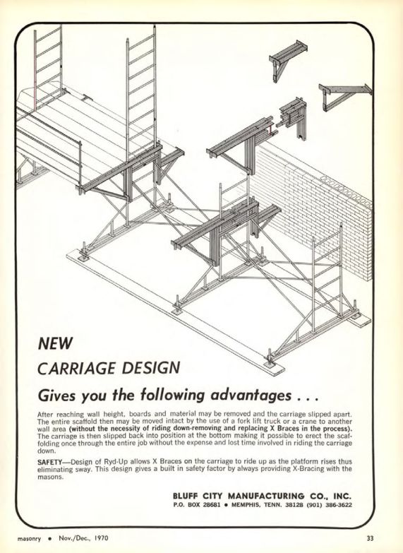 SAFETY-Design of Ryd-Up allows X Braces on the carriage to ride up as the platform rises thus eliminating sway. This design gives a built in safety factor by always providing X-Bracing with the masons.