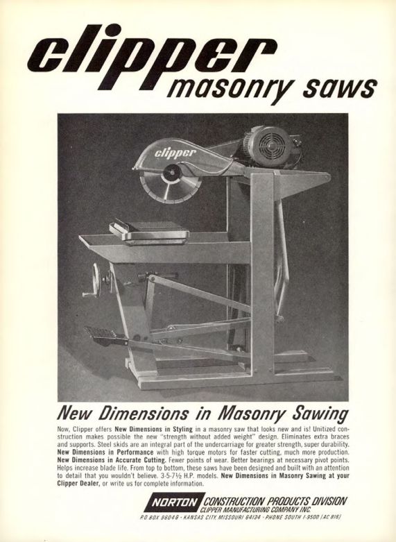 New Dimensions in Performance with high torque motors for faster cutting, much more production. New Dimensions in Accurate Cutting. Fewer points of wear. Better bearings at necessary pivot points. Helps increase blade life. From top to bottom, these saws have been designed and built with an attention to detail that you wouldn't believe. 3-5-74½ H.P. models. New Dimensions in Masonry Sawing at your Clipper Dealer, or write us for complete information.