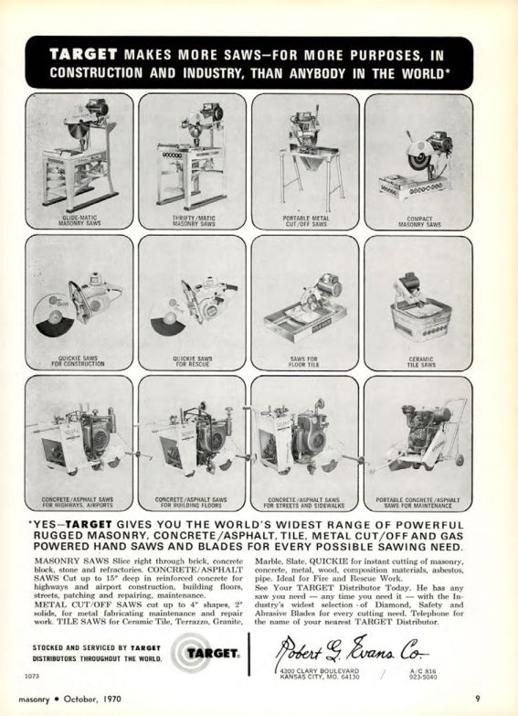 MASONRY SAWS Slice right through brick, concrete block, stone and refractories. CONCRETE/ASPHALT SAWS Cut up to 15" deep in reinforced concrete for highways and airport construction, building floors, streets, patching and repairing, maintenance. METAL CUT/OFF SAWS cut up to 4 shapes, 2 solids, for metal fabricating maintenance and repair work. TILE SAWS for Ceramic Tile, Terrazzo, Granite, Marble, Slate, QUICKIE for instant cutting of masonry, concrete, metal, wood, composition materials, asbestos, pipe. Ideal for Fire and Rescue Work.