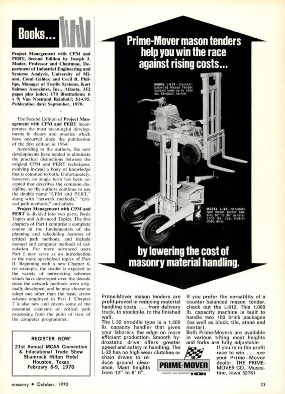 Project Management with CPM and PERT, Second Edition by Joseph J. Moder, Professor and Chairman, Department of Industrial Engineering and Systems Analysis, University of Miami, Coral Gables and Cecil R. Phillips, Manager of Textile Systems, Kurt Salmon Associates, Inc., Atlanta. 352 pages plus index; 170 illustrations; 6 x 9; Van Nostrand Reinhold; $14.95. Publication date: September, 1970.