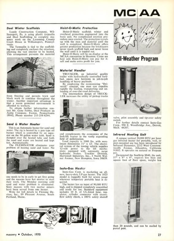 Hoist-O-Matic scaffold; winter and overhead protection engineered into the basic unit. No complicated erection procedure once erected. The protection travels up with the men and material until the wall is completed. Hoist-O-Matic offers greater production because the bricklayers never reach scaffold high and never leave the wall until it is topped out.