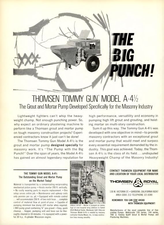 The Thomsen Tommy Gun Model A-4½ is the grout and mortar pump designed specially for masonry work. It's "The Pump with the Big Punch!" Over the span of years, the Model A-42 has gained an almost legendary reputation for high performance, versatility and economy in pumping high lift grout and grouting, and hoisting mortar on multi-story construction.