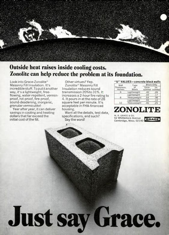 Look into Grace-Zonolite® Masonry Fill Insulation. It's incredible stuff. To put it another way, it's a lightweight, free-flowing, water-repellent, vermin proof, rot-proof, fire-proof, sound-deadening, inorganic, granular vermiculite!