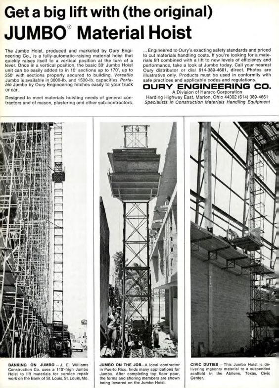 The Jumbo Hoist, produced and marketed by Oury Engineering Co., is a fully-automatic-raising material hoist that quickly raises itself to a vertical position at the turn of a lever. Once in a vertical position, the basic 30' Jumbo Hoist unit can be easily added to in 10' sections up to 170', up to 250' with sections properly secured to building. Versatile Jumbo is available in 3000-lb, and 1500-lb, capacities. Portable Jumbo by Oury Engineering hitches easily to your truck or car.