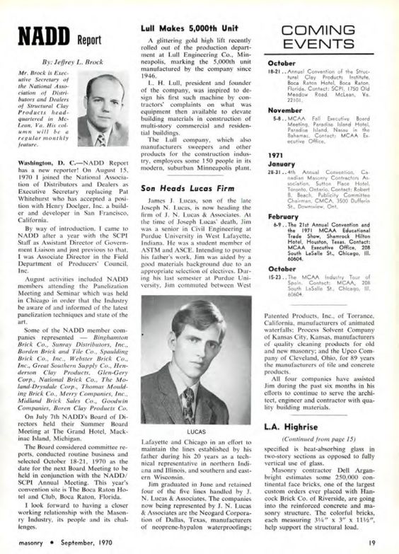 Jim graduated in June and retained four of the five lines handled by J. N. Lucas & Associates. The companies now being represented by J. N. Lucas & Associates are the Neogard Corporation of Dallas, Texas, manufacturers of neoprene-hypalon waterproofings; Patented Products, Inc., of Torrance, California, manufacturers of animated waterfalls; Process Solvent Company of Kansas City, Kansas, manufacturers of quality cleaning products for old and new masonry; and the Upco Company of Cleveland, Ohio, for 89 years the manufacturers of tile and concrete products.