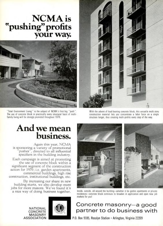Each campaign is aimed at promoting the use of concrete block within a significant segment of the construction action for 1970; i.e. garden apartments, commercial buildings, high rise construction, institutional buildings, etc.