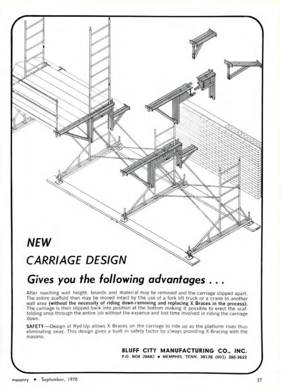 SAFETY-Design of Ryd-Up allows X Braces on the carriage to ride up as the platform rises thus eliminating sway. This design gives a built in safety factor by always providing X-Bracing with the masons.