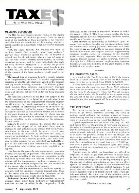 The IRS has just issued a lengthy ruling on the income tax consequences of medicare payments from the standpoint of the taxability of those payments to the recipients and also from the standpoint of determining whether a person qualifies as a dependent when he receives medicare benefits.