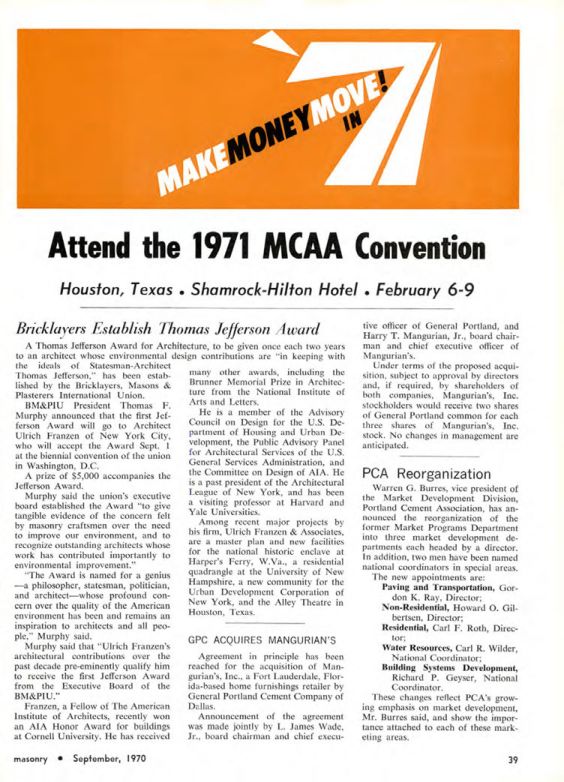 A Thomas Jefferson Award for Architecture, to be given once each two years to an architect whose environmental design contributions are "in keeping with the ideals of Statesman-Architect Thomas Jefferson," has been established by the Bricklayers, Masons & Plasterers International Union. BM&PIU President Thomas F. Murphy announced that the first Jefferson Award will go to Architect Ulrich Franzen of New York City, who will accept the Award Sept. 1 at the biennial convention of the union in Washington, D.C.