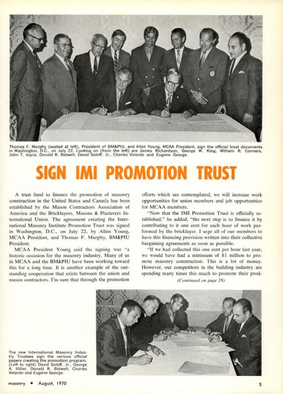 A trust fund to finance the promotion of masonry construction in the United States and Canada has been established by the Mason Contractors Association of America and the Bricklayers, Masons & Plasterers International Union. The agreement creating the International Masonry Institute Promotion Trust was signed in Washington, D.C., on July 22, by Allen Young, MCAA President, and Thomas F. Murphy, BM&PIU President.