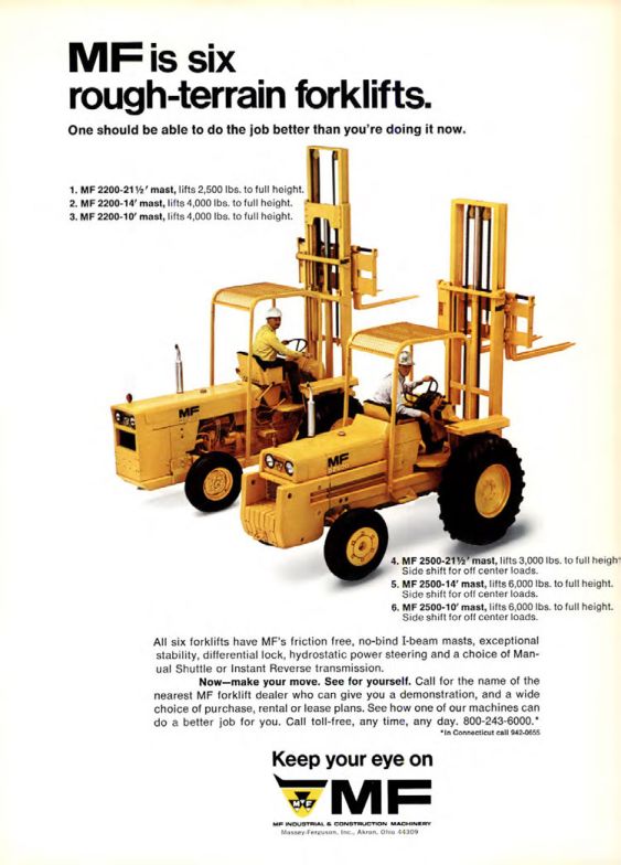 Now-make your move. See for yourself. Call for the name of the nearest MF forklift dealer who can give you a demonstration, and a wide choice of purchase, rental or lease plans. See how one of our machines can do a better job for you. Call toll-free, any time, any day. 800-243-6000.*