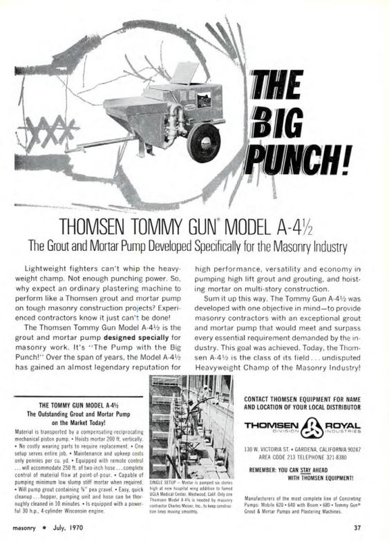 The Thomsen Tommy Gun Model A-4½ is the grout and mortar pump designed specially for masonry work. It's "The Pump with the Big Punch!" Over the span of years, the Model A-4½ has gained an almost legendary reputation for high performance, versatility and economy in pumping high lift grout and grouting, and hoisting mortar on multi-story construction.