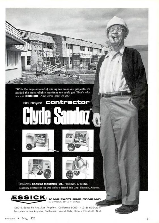 So says: contractor Clyde Sandoz, president, SANDOZ MASONRY CO., PHOENIX, ARIZONA. Masonry contractor for Del Webb's famed Sun City, Phoenix, Arizona.
