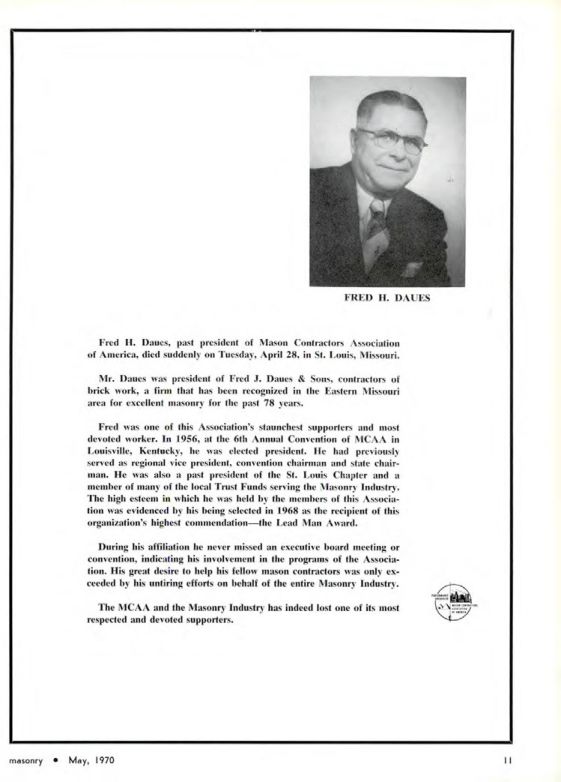 Fred H. Daues, past president of Mason Contractors Association of America, died suddenly on Tuesday, April 28, in St. Louis, Missouri.