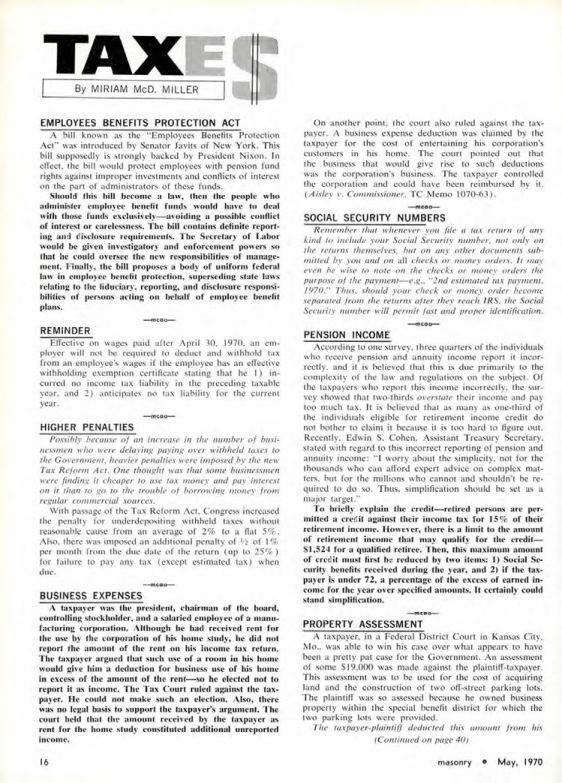 Possibly because of an increase in the number of businessmen who were delaying paying over withheld taxes to the Government, heavier penalties were imposed by the new Tax Reform Act. One thought was that some businessmen were finding it cheaper to use tax money and pay interest on it than to go to the trouble of borrowing money from regular commercial sources.