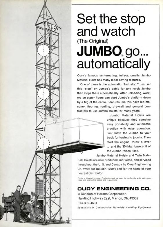 Jumbo Material Hoists and Twin Materials Hoists are now produced, marketed, and serviced throughout the U. S. and Canada by Oury Engineering Co. Write for Bulletin 1050R and for the name of your nearest distributor.