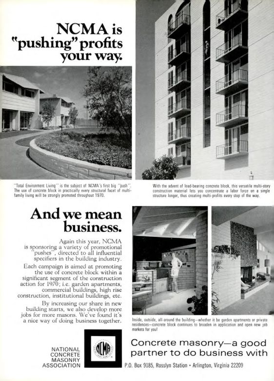 Each campaign is aimed at promoting the use of concrete block within a significant segment of the construction action for 1970; i.e. garden apartments, commercial buildings, high rise construction, institutional buildings, etc.