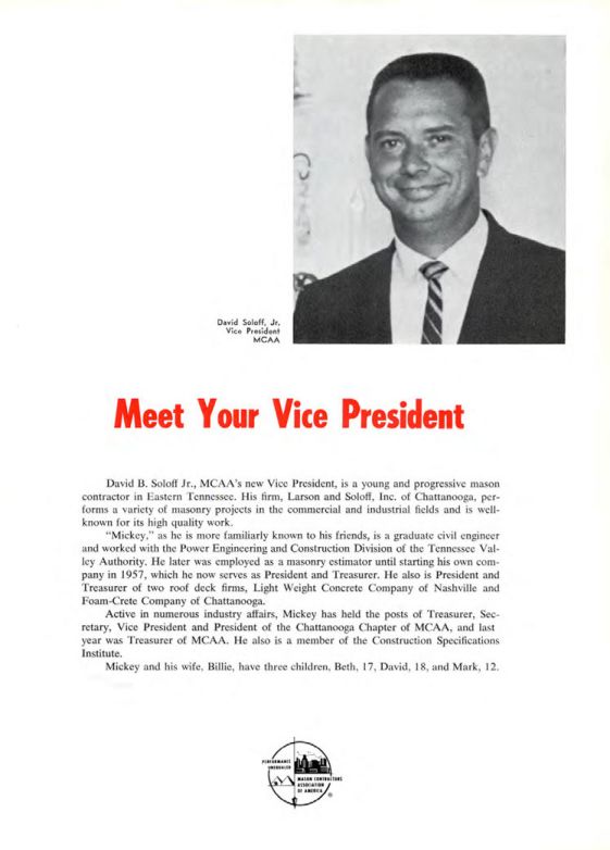David B. Soloff Jr., MCAA's new Vice President, is a young and progressive mason contractor in Eastern Tennessee. His firm, Larson and Soloff, Inc. of Chattanooga, performs a variety of masonry projects in the commercial and industrial fields and is well-known for its high quality work.