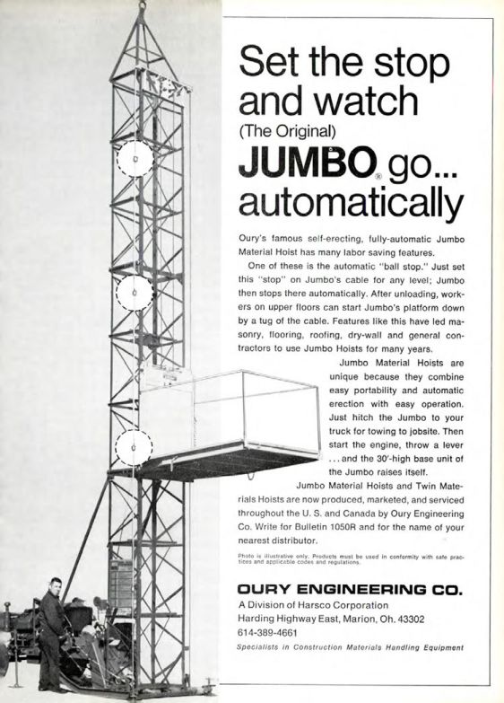 Jumbo Material Hoists and Twin Mate-rials Hoists are now produced, marketed, and serviced throughout the U. S. and Canada by Oury Engineering Co. Write for Bulletin 1050R and for the name of your nearest distributor.